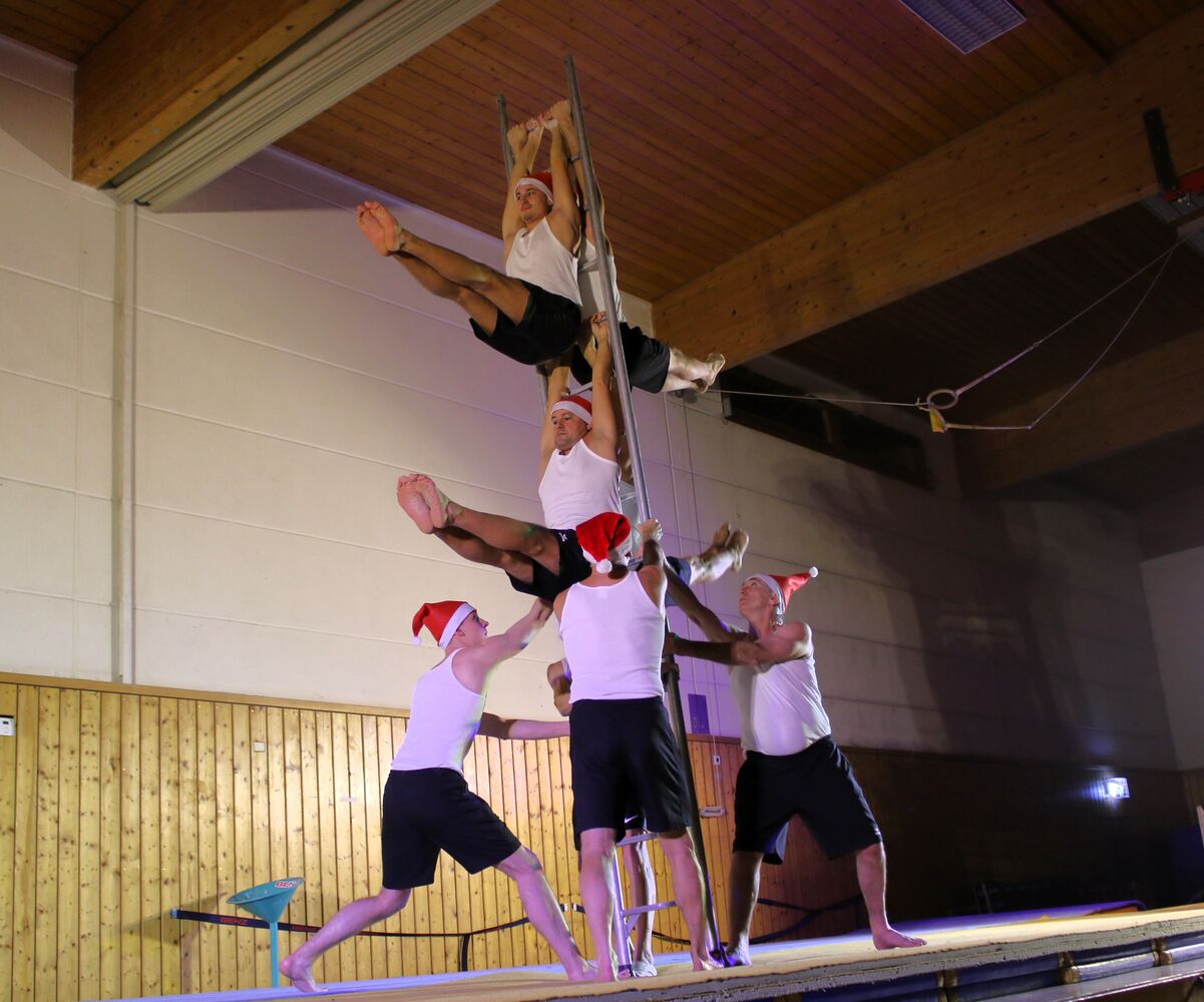 Als Cheerleader feuerten sich die Turnmädchen zwischen 10 und 15 Jahren bei ihren Darbietungen selbst an, bevor es für die Leistungsturnerinnen auf dem Trampolin hoch hinaus ging. Apropos: Dass man das Hallendach mit einer senkrecht aufgestellten Leiter erreichen kann und dazu keine Stützen braucht, sondern einfach nur die Muskelkraft der Teamkollegen, stellten die männlichen Turner vom jungen Erwachsenen bis zum Senior unter Beweis.