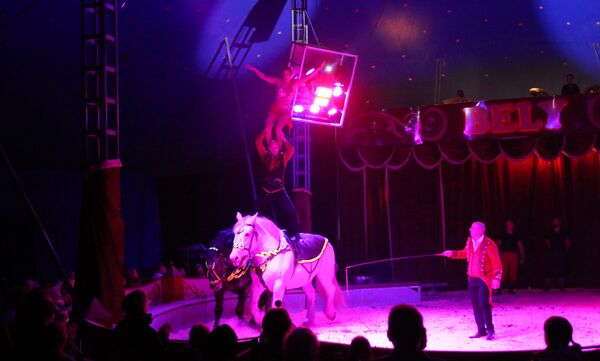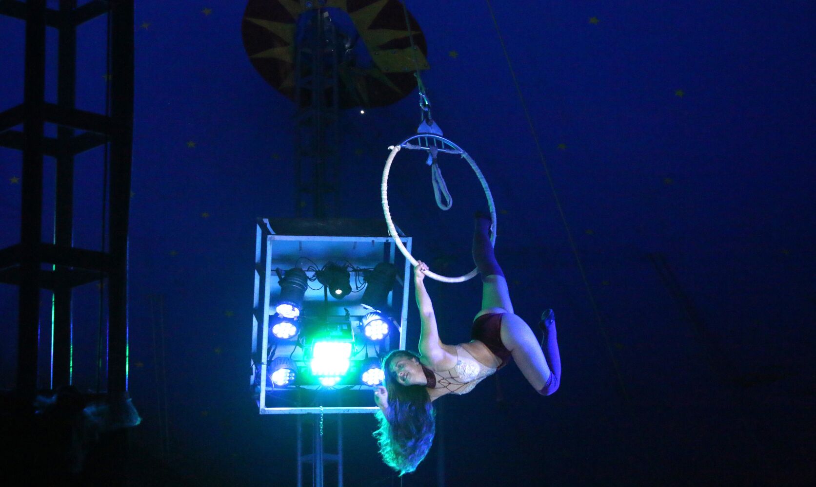 Mit dabei hat die 15-köpfige Artistenfamilie um Marina und Harry Frank-Bely mit ihren vier Kindern und fünf Enkeln eine zweistündige leidenschaftliche Mischung aus altbewährten und modernen neuen Nummern, mit denen sie den Familiencircus in neunter Generation ins Hier und Heute bringen. Gerade noch begrüßt Juniorchef Nino mit gereimtem Witz das erwartungsvolle Publikum, schon wirbeln seine Schwester Neyenne und ihr Partner Adrian auf dem Rücken französischer Pferde durch die Manege – er mit je einem Fuß auf einem Pferd und sie auf seinen Schultern balancierend. Der Atem stockt so manchem Zuschauer, als sich Nanja ebenso wie später Diana in glitzernden Kleidern in Tüchern und Ringen an die fast zwölf Meter hohe Zeltkuppe wagen – mit Muskelkraft gezogen und gesichert von ihren Männern.