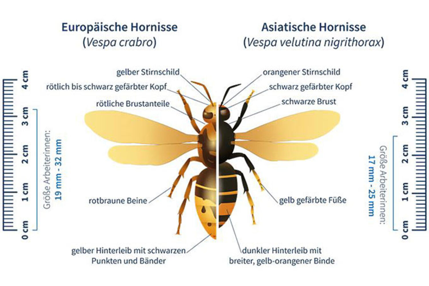 Hierbei ist zunächst Entwarnung notwendig: Bei der invasiven Art handelt es sich nicht um die Asiatische Riesenhornisse (Vespa mandarinia), die vor allem für ihre Ausbreitung in den USA als bedrohliche Art Schlagzeilen gemacht hat. Diese kommt noch nicht in Europa vor. Es geht stattdessen um die Asiatische Hornisse (Vespa velutina), die zur gleichen Familie wie die Europäische Hornisse (Vespa crabro) gehört und tatsächlich kleiner als diese ist. Sie ist anhand ihres dunklen Körpers mit gelben Füßen von den rotbraunen und gelben Tieren der heimischen Art zu unterscheiden. Ihr schwarz gefärbter Kopf trägt ein orangenes Stirnschild, während ihr schwarzer Unterleib breite, gelb-orangene Binden trägt.