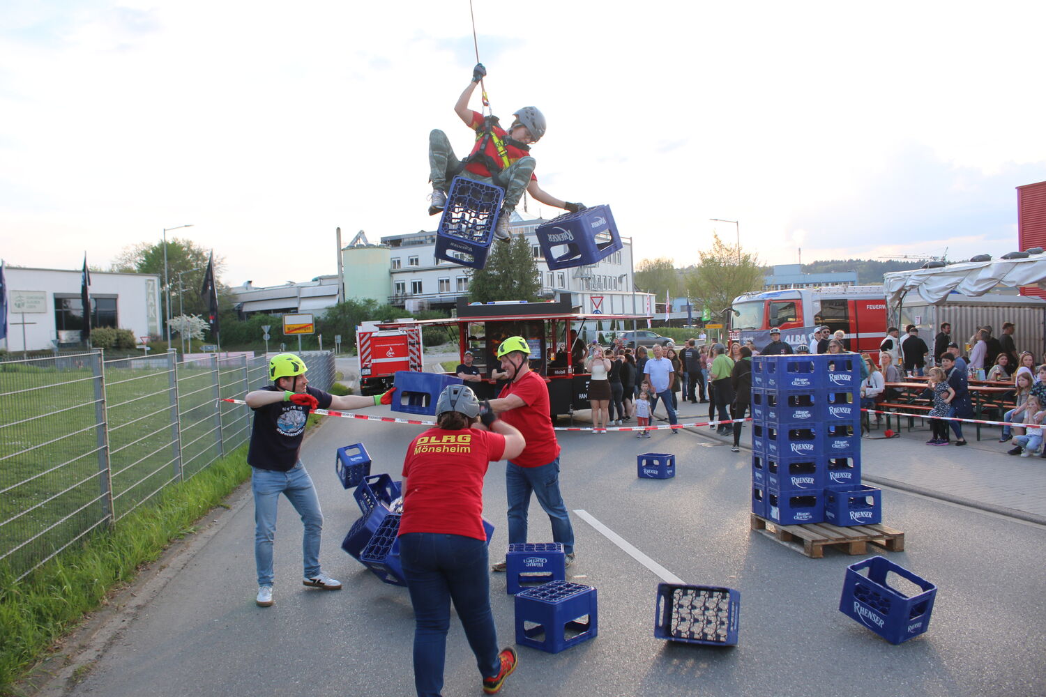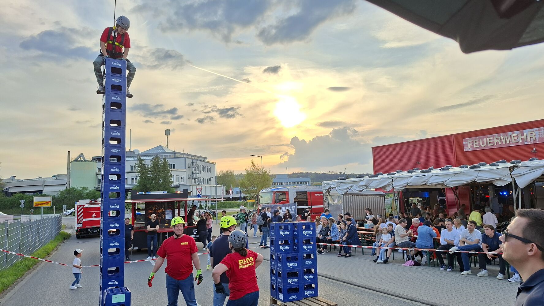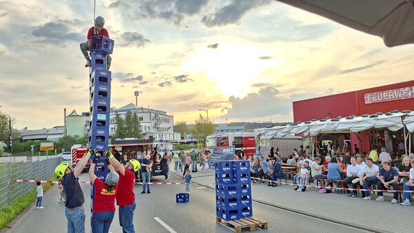 Eine wackelige Angelegenheit war das diesjährige Ochsenfest der Freiwilligen Feuerwehr Remchingen Abteilung Nord. Wackelig war zwar weder das Festzelt, das ab Samstagnachmittag immer wieder gut gefüllt war, noch der stattliche Ochse am Spieß, der ab dem frühen Sonntagmorgen seine Runden über dem Feuer drehte und zum Nachmittag hin ziemlich ausgedünnt war – sondern vielmehr ein heiterer Wettbewerb, zu dem die Kameraden aufgerufen hatten. Dabei mussten Vereine oder Gruppen innerhalb von fünf Minuten so viele Getränkekisten in die Höhe stapeln wie möglich – aus eigener Kraft durch seitliches Hochklettern an die Kisten. Für die Sicherung sorgten ein von einem Entsorgungsunternehmen zur Verfügung gestellter Kran und die Absturzsicherungstruppen der beiden Remchinger Feuerwehrabteilungen.
