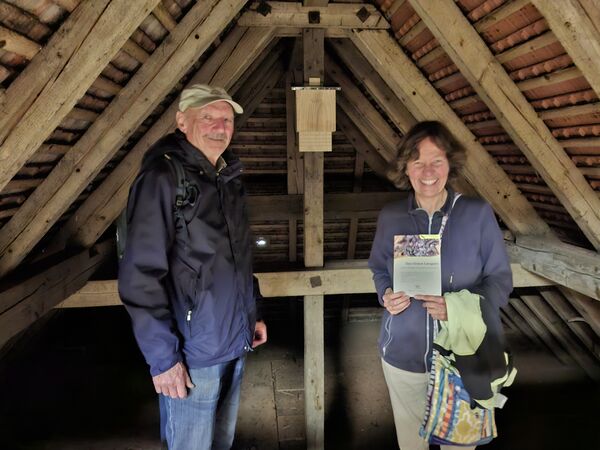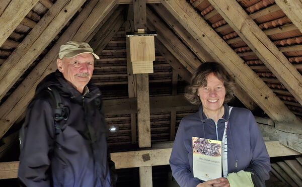 Dabei können kleine Maßnahmen Großes bewirken, wie ein Blick ins sonst verborgene Dachgeschoss der Kirche zeigt. Unter dem Gebälk hat Troost gemeinsam mit Peter Stähle Nistkästen für Fledermäuse angebracht – und gleichzeitig die Lüftungsöffnungen des Kirchendachs wieder geöffnet. Zum Schutz vor Tauben und Marder hatte man diese vor Jahrzehnten geschlossen. Der Trick: eine einfache Holzkonstruktion verkleinert die Öffnungen nun auf vier Zentimeter – groß genug für das hier heimische Graue Langohr, klein genug, um ungebetene Gäste abzuwehren. Damit sich die Nachtschwärmer wohlfühlen und die Kirche im Sommer als Wochenstube nutzen können, haben die beiden die Fenster am ohnehin ungenutzten Dachgeschoß verdunkelt. „Die Öffnungen an der dunklen Friedhofsseite kommen uns sehr entgegen, ebenso wie die alten Scheunen außenherum, in denen die Fledermäuse vielleicht ein Winterquertier finden“, freut sich Stähle und hofft auf eine Akzeptanz durch die fliegenden Säugetiere. Dazu könne auch eine Abschaltung des Turmstrahlers beitragen, wenngleich dieser auch eine kulturelle Bedeutung hat.