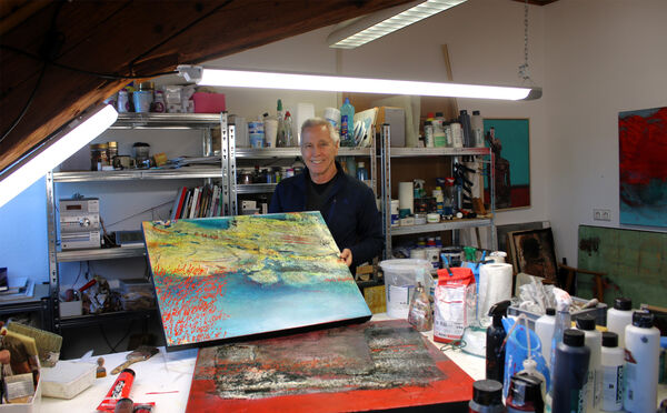 Dem Mitsiebziger, der neben Germanistik und Sportwissenschaften auch Kunsttherapie studiert hatte, blieb während seiner beruflichen Tätigkeit bis auf die Gestaltung von Plakaten und Programmheften kaum Zeit für die Kunst. In der neu gewonnen Zeit, die er gerne auch fürs Mountainbiken und Skifahren, für Kulturbesuche und Reisen mit seiner Frau nutzt, hat er sich von Neuem Inspiration bei Kursen an Kunstakademien geholt. Rund 60 ausgewählte Werke präsentiert Haag in seiner bereits zweiten Ausstellung im Rathausneubau: „Mit seiner architektonischen Zurückhaltung und klaren Beschränkung auf Beton, Holz und Glas ohne Firlefanz ist das Rathaus geradezu gemacht für Ausstellungen“, freut er sich. Jedes seiner Bilder trägt einen Namen, den Haag aber bewusst offenhalte, um Spielraum für die Interpretation zu lassen – etwa „Was bleibt“ oder „Wenn man das so betrachtet“.