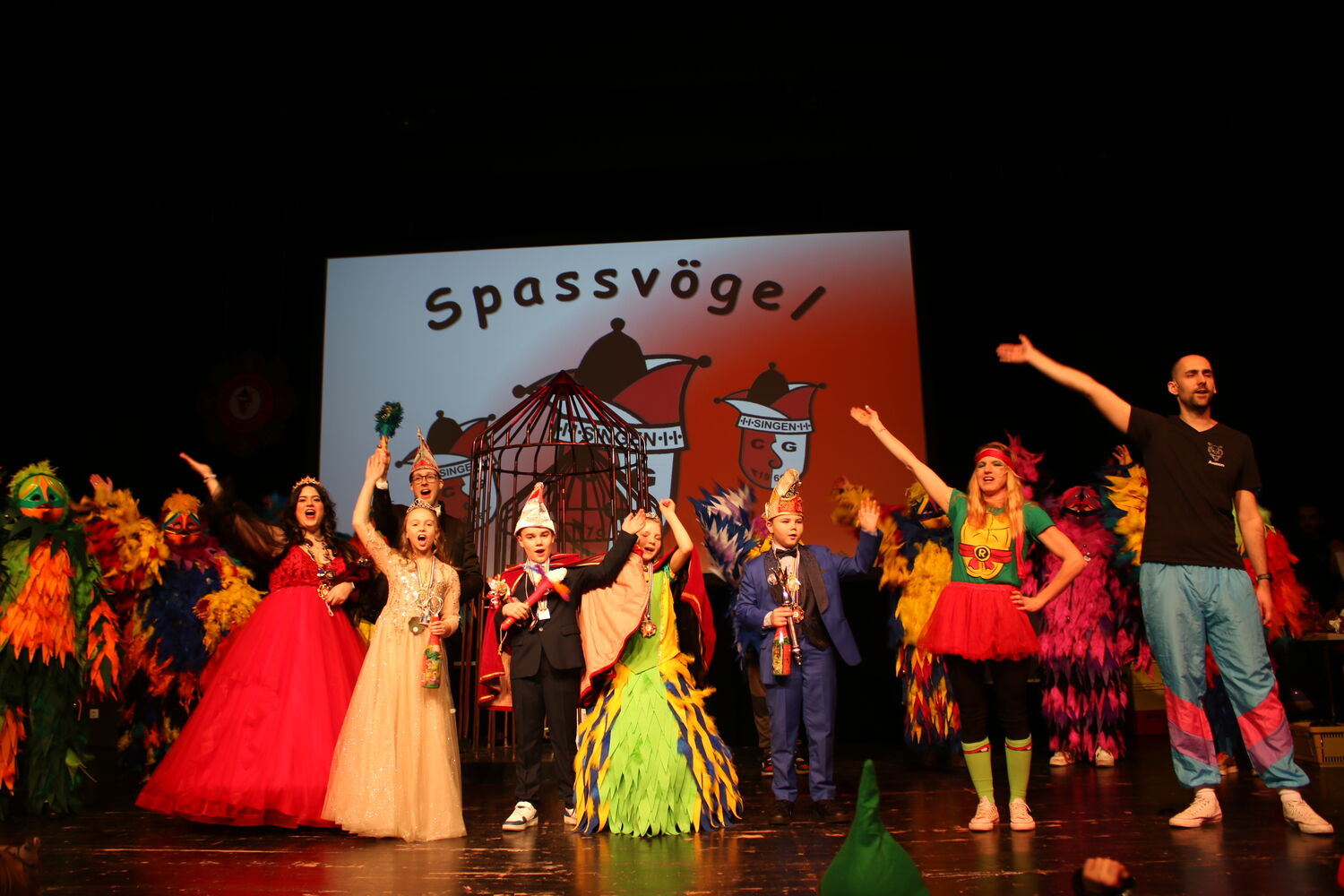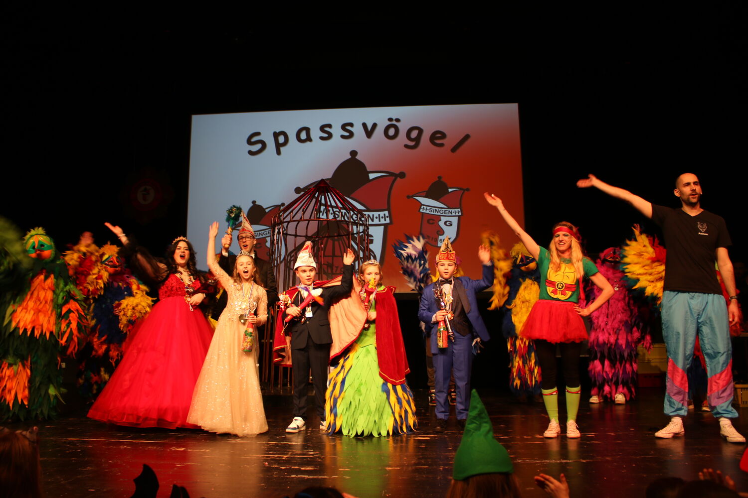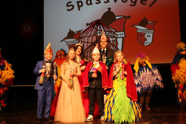Den farbenfrohen Auftakt beim Kinderfasching machte die Vogelgruppe, die einen geheimnisvollen Käfig auf die Bühne rollte: Daraus entflatterten die Achtjährige Emma I. (Kirchgäßner) und der Zehnjährige Lionel I. (Speck). Sie übernahmen als neues Kinderprinzenpaar das Regiment. Zusammen mit den Moderatoren Franziska Zeiher und Marcel Scherer sowie Melitta Braunschweig vom Spaßmacher-Team holten sie einige der vor der Bühne dicht gedrängten Kinder immer wieder nach oben zu heiteren Spielen.