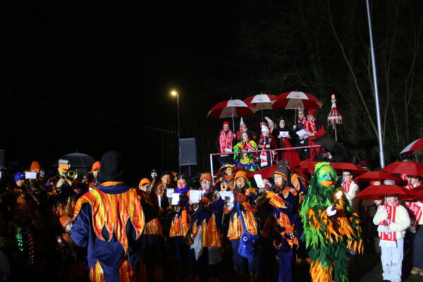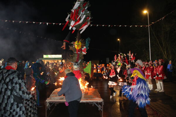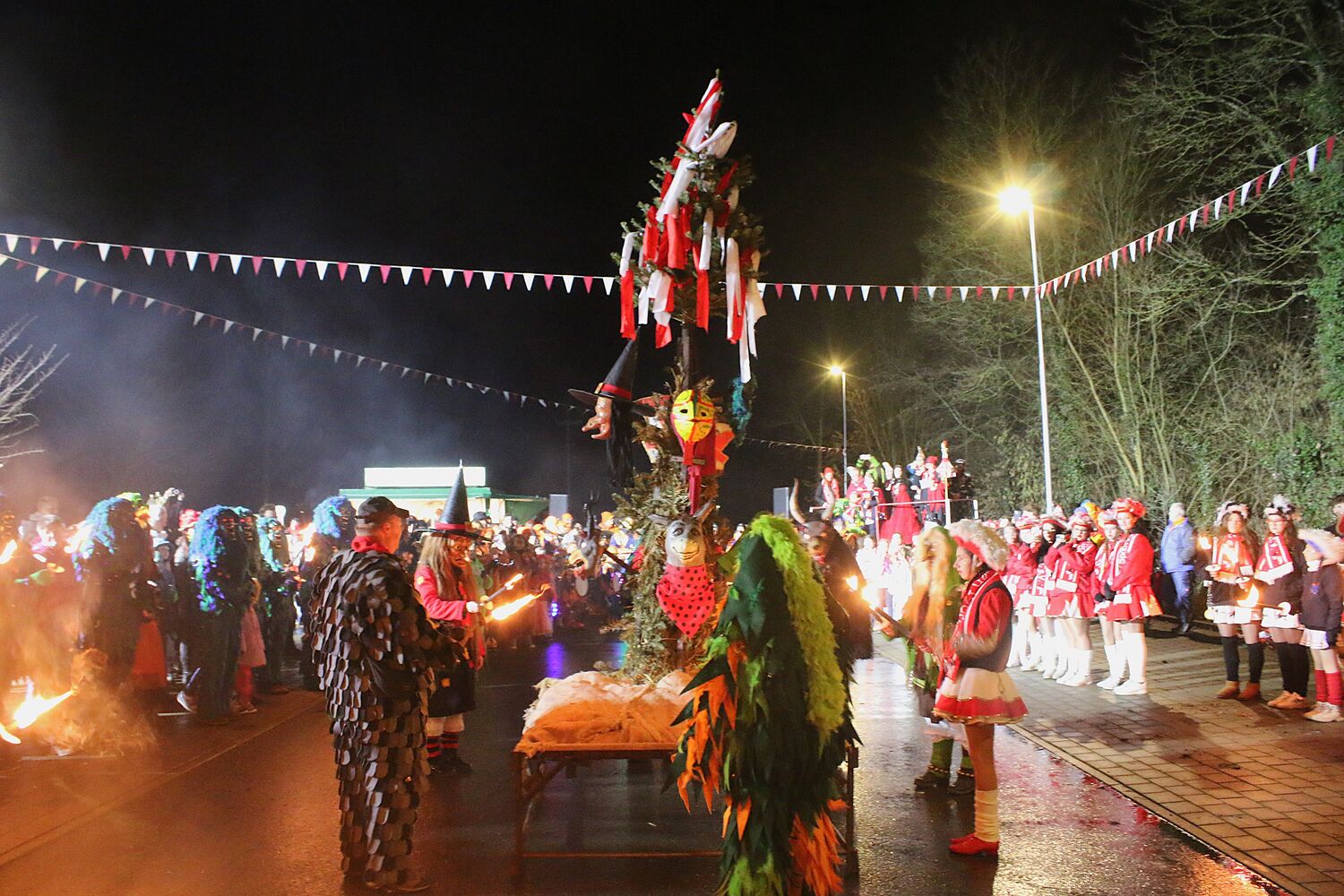 Zuvor zogen am Dienstagabend zahlreiche Töpfleshexen und Bäredaifel, Keltereckesel, Pfinztolle, Spaßvögel, Strohhexen, Gardetänzer und Guggenmusiker der Bääreklopfer einen mit Masken bunt geschmückten Narrenbaum durchs Dorf bis zum Narrenplätze am Eingang der Singener Marktstraße. Mit ihren lodernden Fackeln entzündeten sie das Kunstwerk und tanzten um die lodernden Flammen – samt Feuerwerk am Himmel. Dabei stellte Nonnenmacher den Einsatz der Faschingsgruppen für die Demokratie und Vielfalt heraus: „Demokratie ist nicht still, sie ist laut und lebendig“, betonte er mit Blick auf Büttenreden und Motivwagen, die das Salz in der Suppe und nicht immer Zuckerguss seien, „In der fünften Jahreszeit haben wir gefeiert, gelacht und die Welt ein bisschen bunter gemacht.“