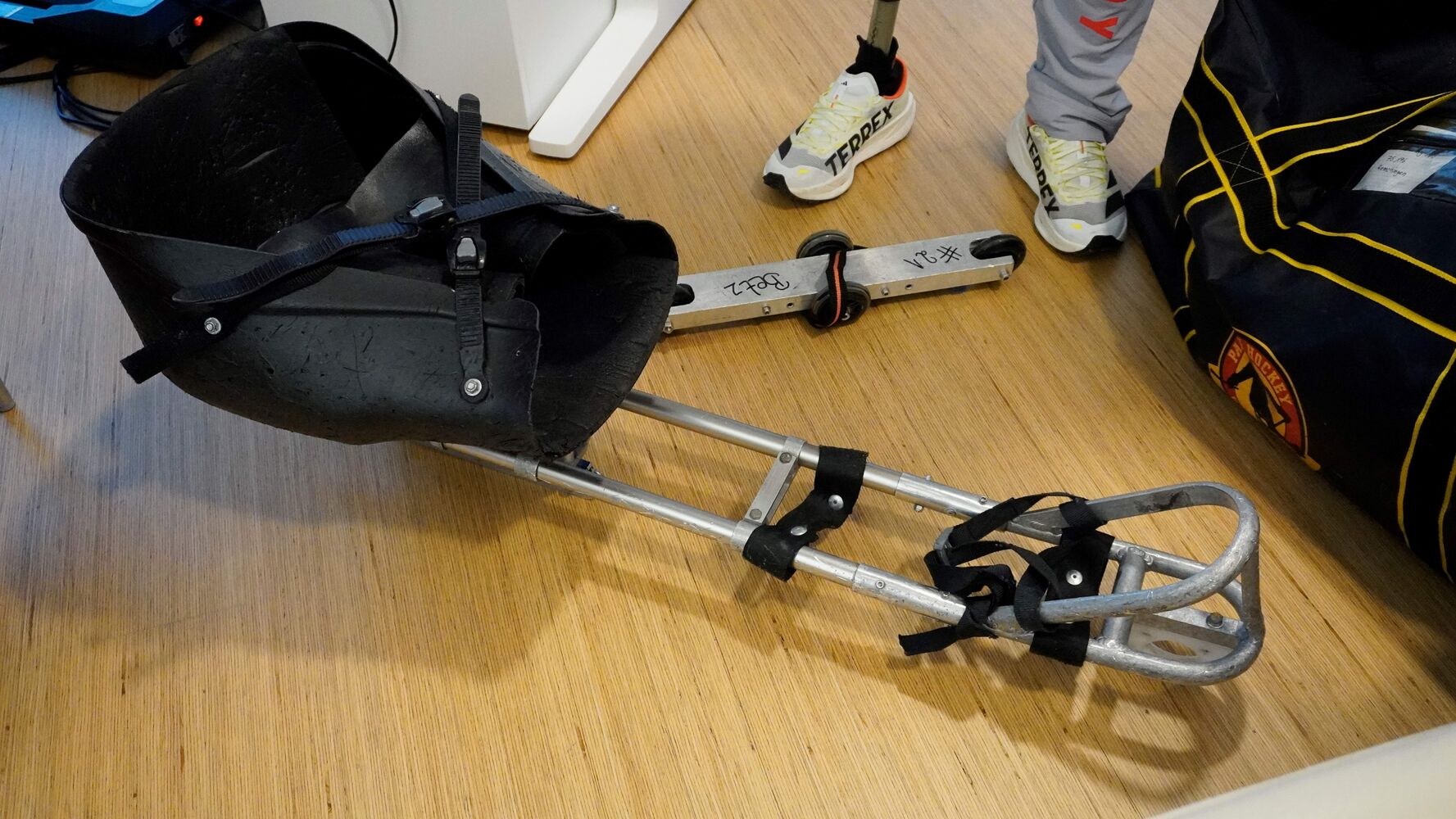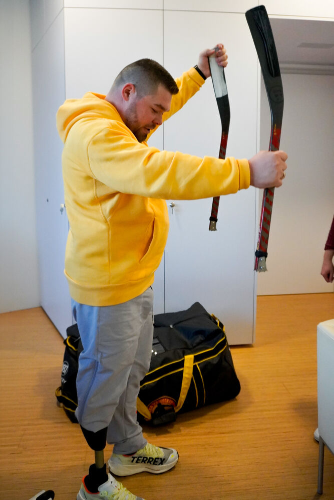 Diese Einstellung zum Leben, in allem etwas Gutes zu sehen, hat den jungen Vater von zwei Töchtern weit gebracht. Während seiner Ausbildung zum Feinwerkmechaniker wurde sein rechtes Bein unterhalb des Knies bei einem Arbeitsunfall im Alter von 15 Jahren zerquetscht und später amputiert. Aufgeben? Für Betz keine Option. Mit Hilfe von Freunden und Familie schaffte er es, seine Situation anzunehmen. Von seinem bisherigen Hobby, dem Fußball, verabschiedete er sich und kam zum Eishockey. Er spielte zunächst in einer Para-Mannschaft in Heidelberg, die sich 2015 auflöste. Vor vier Jahren wollte Betz wieder einsteigen, hat sich mit seinem ca. 2.000 Euro teuren Equipment ausgestattet und sich auf die Suche nach Mitstreitern gemacht. Mehr durch Zufall ist er bei einem Trainingslager der Nationalmannschaft gelandet und wurde schließlich als Verteidiger Teil des Teams. Betz zeigt, wie die beiden Schläger genutzt werden.