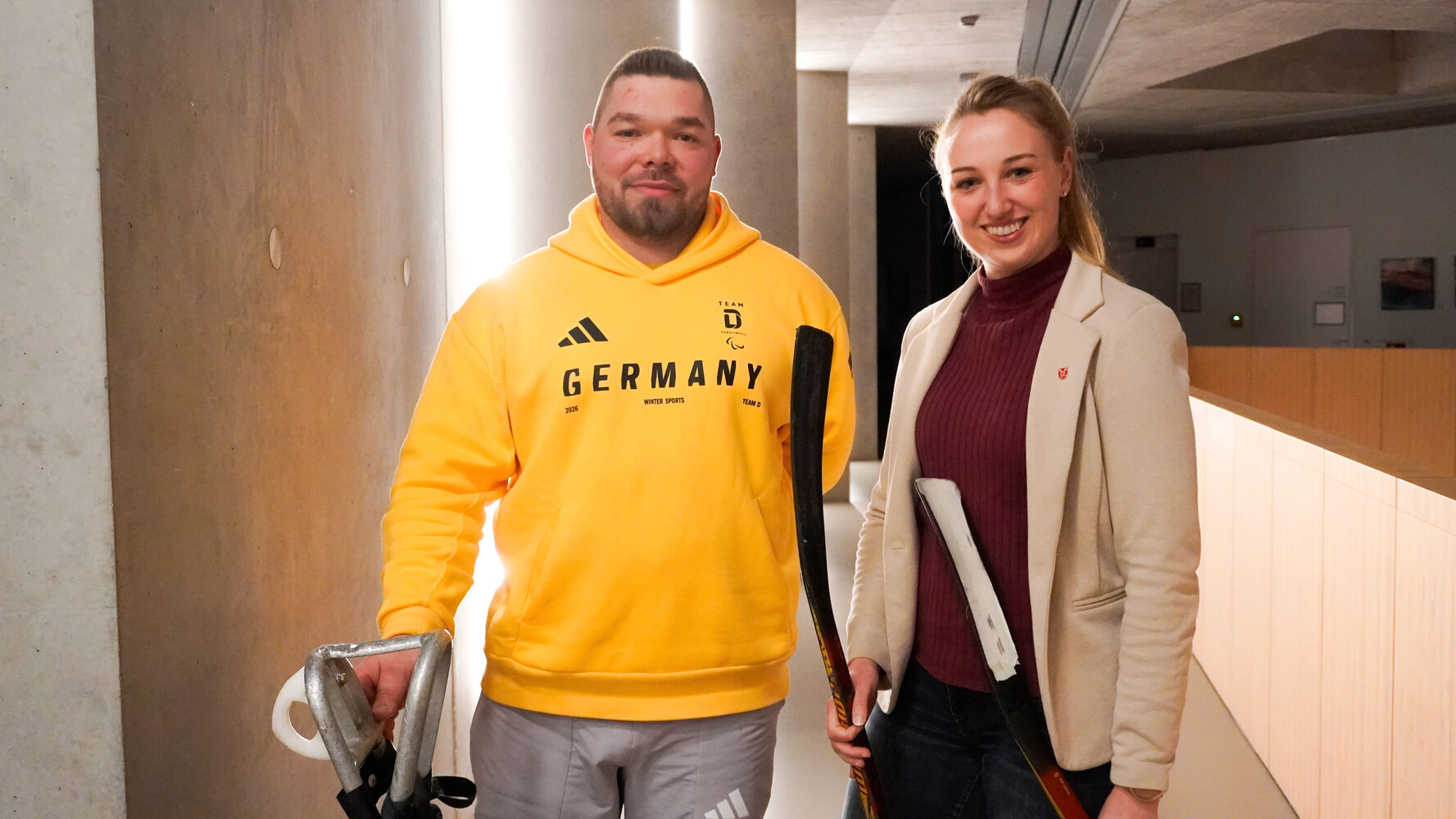 Dass es beim Para-Eishockey nicht nur körperliche, sondern auch geistige Ausdauer braucht, hat Remchingens Bürgermeisterin Julia Wieland bei einem Treffen mit Betz festgestellt. Sie hat den 33-Jährigen nach den Spielen im Rathaus begrüßt und sich genau erklären lassen, wie der Sport funktioniert. Gespielt wird Para-Eishockey von Sportlerinnen und Sportlern, die eine körperliche Einschränkung der unteren Extremitäten haben. Sie sitzen in einem speziellen Schlitten und bewegen sich mit Hilfe zweier Schläger auf dem Eis fort. Das eine Ende der Schläger wird zum Passen und Schießen verwendet, während Spikes am anderen Ende die Fortbewegung erleichtern. Gespielt werden dreimal 15 Minuten mit je fünf Spielern und einem Torhüter. Die Regeln sind denen im Fußgänger-Eishockey sehr ähnlich. „Bei uns gibt es auch zwei Minuten Strafe wegen Beinstellens oder Behinderung“, schmunzelt Betz. Und das zu Recht, denn was auf dem Eis passiert, ist nicht ohne: Bodychecks sind keine Seltenheit und dass ein Schlitten umkippt auch nicht. Deshalb gehört eine Schutzausrüstung inklusive Helm mit Metallgitter zur Grundausstattung.