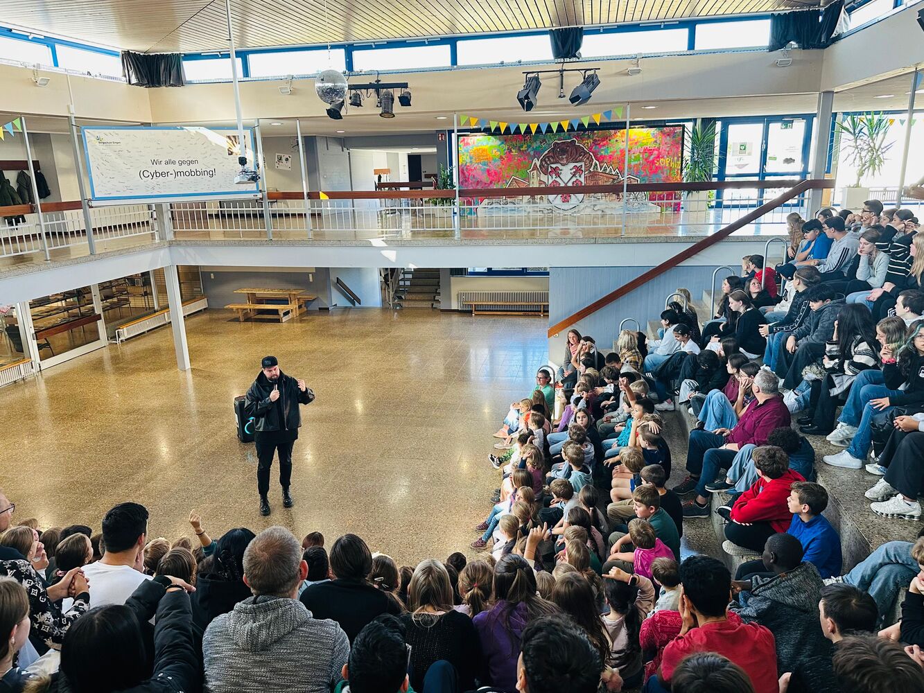 Vor der ganzen Schulgemeinschaft durfte Bauer das Kunstwerk in der Aula vorstellen und mit den gespannten Schülerinnen und Schülern ins Gespräch über seine Arbeit, Träume und Leidenschaften neben Schule und Beruf kommen. Dabei ermutigte er die Kinder und Jugendlichen, ihre eigenen kreativen Wege zu gehen. Die Kunstaktion wirkt weiter nach, unter anderem bei der Gründung von Kunst-Arbeitsgemeinschaften, die den kreativen Austausch und die Kunst im Ort weiter fördern sollen.