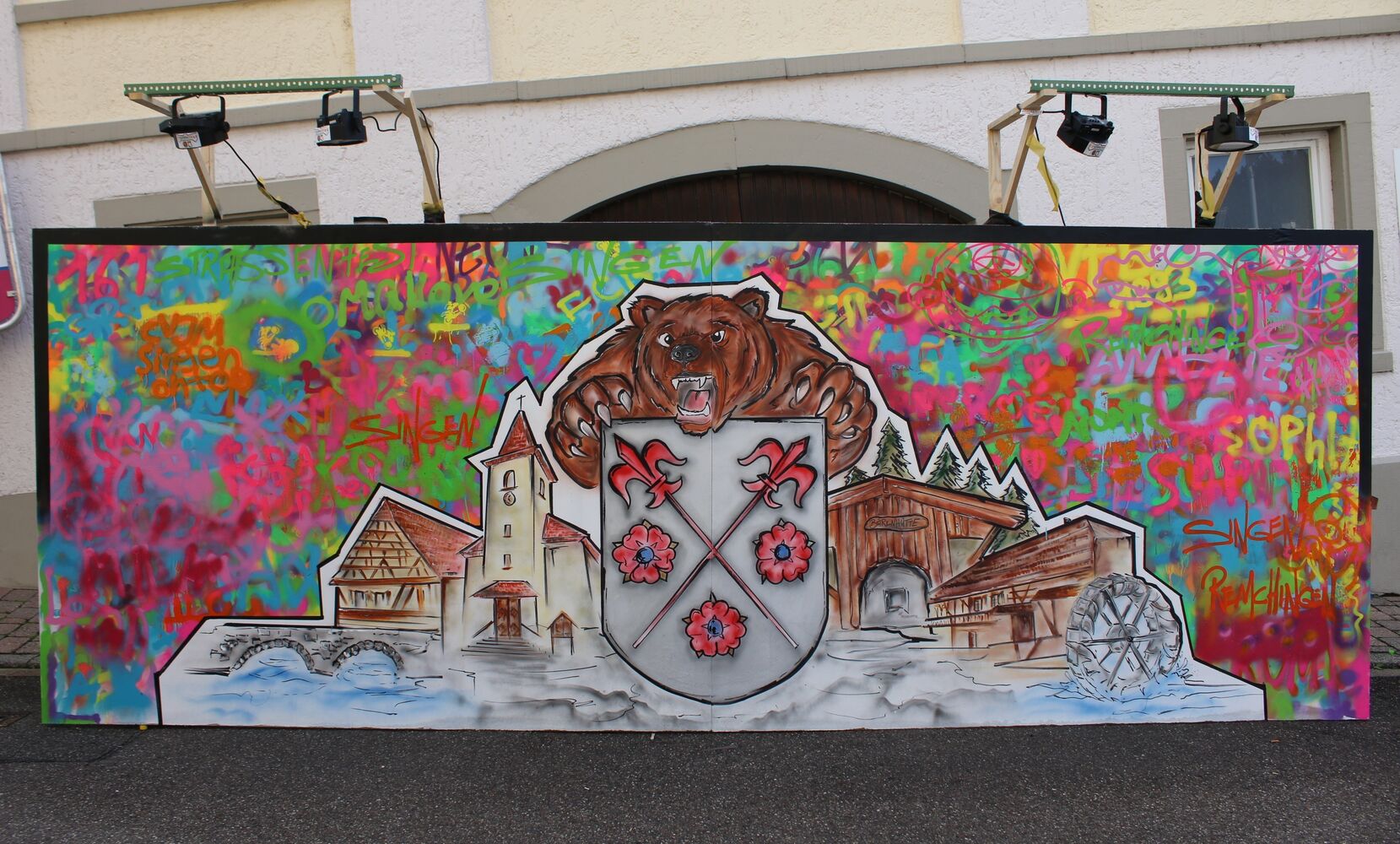 Der Künstler und Designer hatte sich mit einer sechs Meter langen und zwei Meter hohen weißen Wand mitten ins Getümmel am Kirchberg gestellt und lediglich ein paar Skizzen vorbereitet, die insbesondere junge Künstlerinnen und Künstler schnell mit Farbe füllten. Ausgestattet mit Sprühdosen konnten sie ihrer Kreativität nach Lust und Laune freien Lauf lassen. Bis Samstagabend war ein echter Hingucker entstanden. Mittendrin: Der Singener Bär hinter dem Ortswappen vor der Silhouette markanter Singener Gebäude und Plätze.