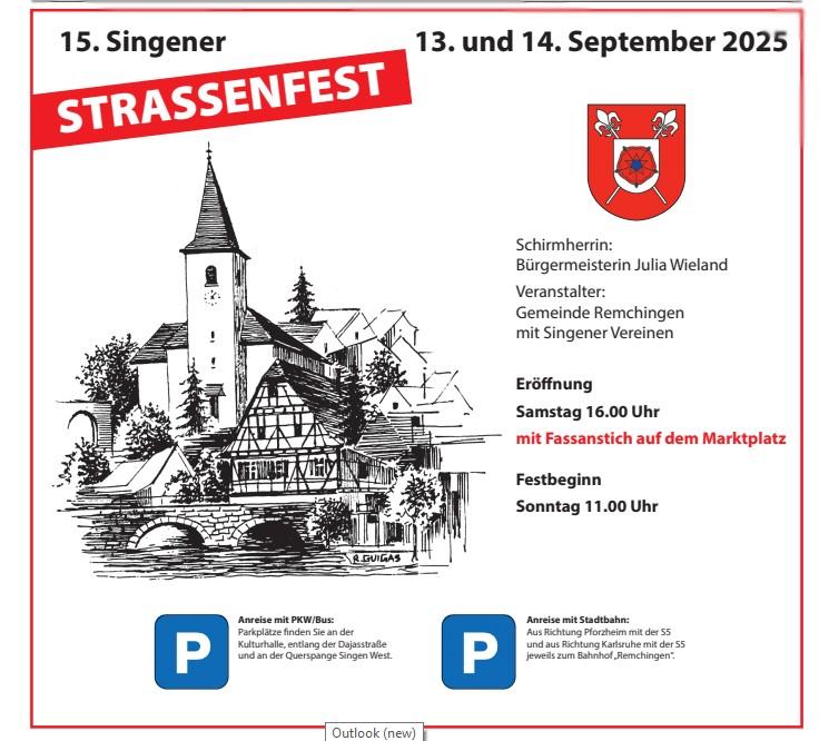 Das Ordnungsamt weist darauf hin, dass die Bereiche Marktstraße und Lammstraße für den Auf- und Abbau des Straßenfestes Singen im Zeitraum vom Freitag, 12. September 2025, 12.00 Uhr bis Montag, 15. September 2025, 15.00 Uhr voll gesperrt sind.